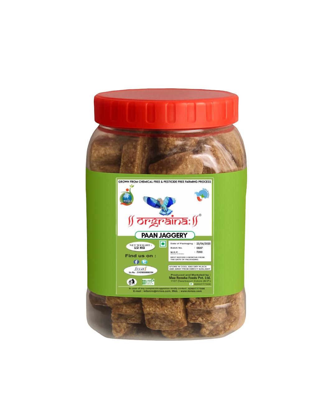 Orgraina Paan Jaggery is a delightful fusion of traditional jaggery and refreshing paan flavor, crafted using pure, chemical-free ingredients. Made from natural sugarcane juice and infused with aromatic paan essence, these bite-sized jaggery pieces are a healthy and flavorful alternative to after-meal sweets. Grown using pesticide-free and chemical-free farming practices, Orgraina ensures purity and authenticity in every piece. This paan jaggery not only satisfies your sweet cravings but also aids digestion and acts as a natural mouth freshener. It’s perfect to serve after meals at home or at gatherings, and ideal for gifting too. Free from artificial flavors, colors, and preservatives, Orgraina Paan Jaggery is a conscious choice for those seeking clean and traditional Indian indulgences. Packed in a hygienic jar for convenience and long-lasting freshness.